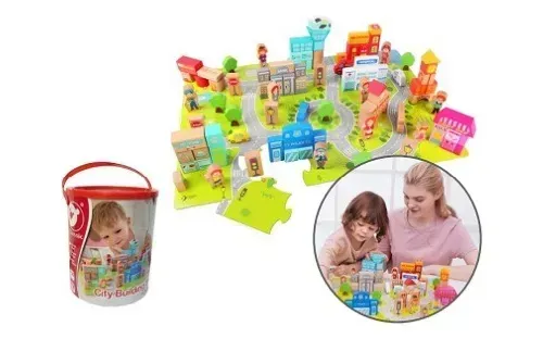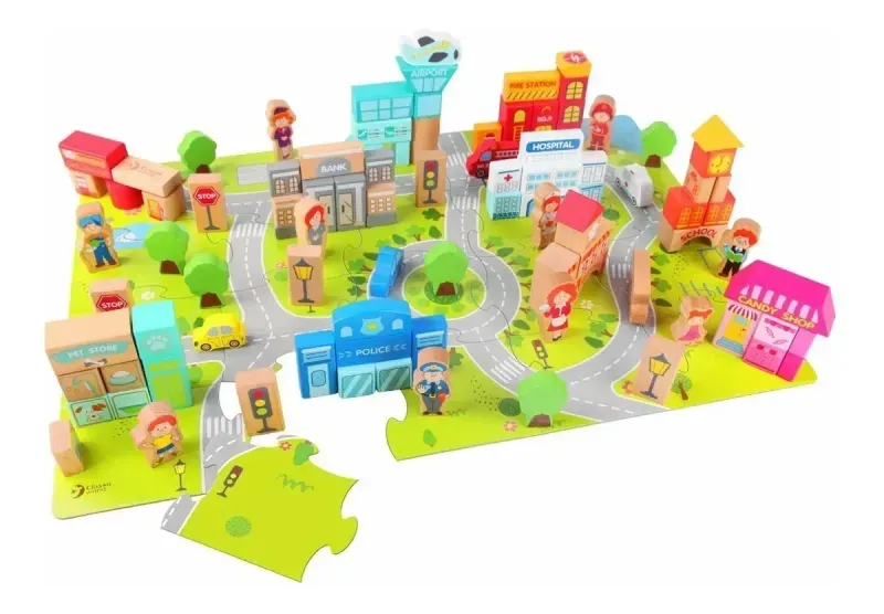 El juego incluye 120 bloques con figuras y edificios de la ciudad. Tu hijo será capaz de reconocer las figuras y de colocarlas en el edificio correcto, aprendiendo así sobre distintos lugares de la ciudad.