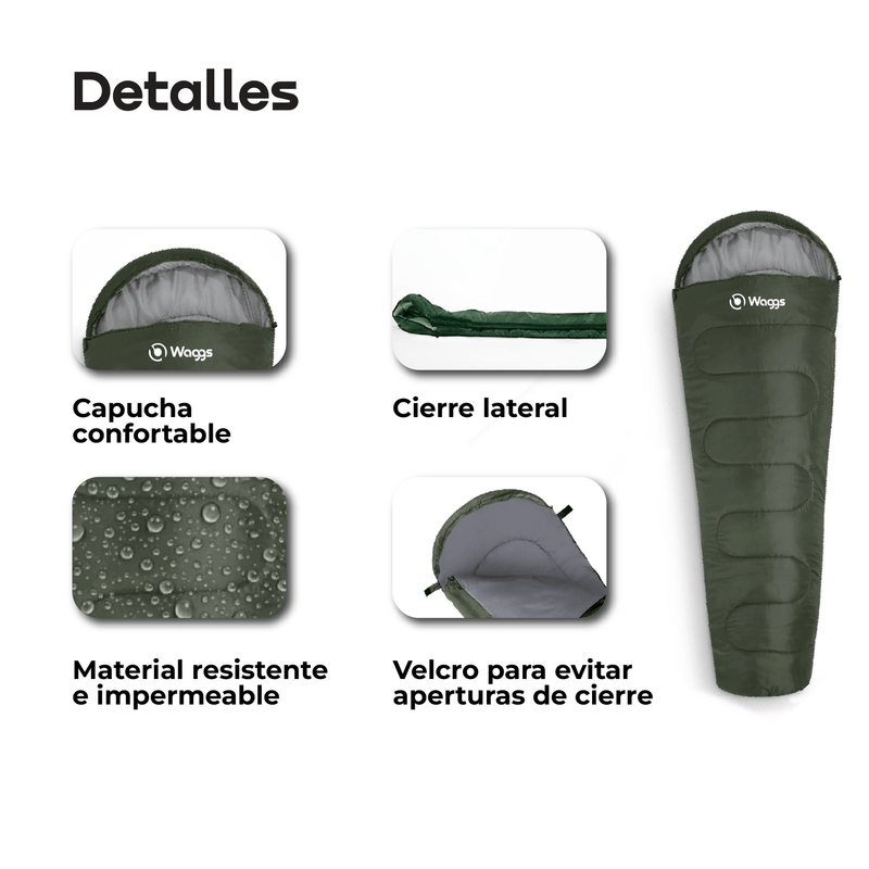La bolsa de dormir WAGGS BOLD02 combina abrigo, confort y practicidad para acompañarte en camping, trekking o escapadas al aire libre, gracias a su diseño tipo momia con capucha ajustable que mejora la retención del calor corporal y protege del viento en noches frías. Fabricada con una mezcla resistente y cómoda de 70 % poliéster y 30 % algodón, cuenta con aislamiento sintético de alta eficiencia, interior respirable y costuras reforzadas para un uso prolongado. Ofrece un rango térmico estimado de 0 °C a 10 °C, cierre lateral con solapa interna, medidas amplias de 220 × 80 cm y un peso aproximado de 1,5 kg, además de incluir bolsa compresora para guardado y transporte compacto, logrando el equilibrio ideal entre durabilidad, comodidad y fácil traslado.