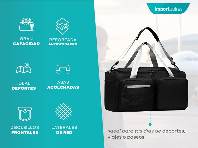 Este bolso Reebok es tu aliado para entrenar, viajar o escaparte. Liviano, resistente y con múltiples bolsillos que se adaptan a vos. Organizado por dentro, cómodo por fuera. Te movés con estilo, comodidad y seguridad.
