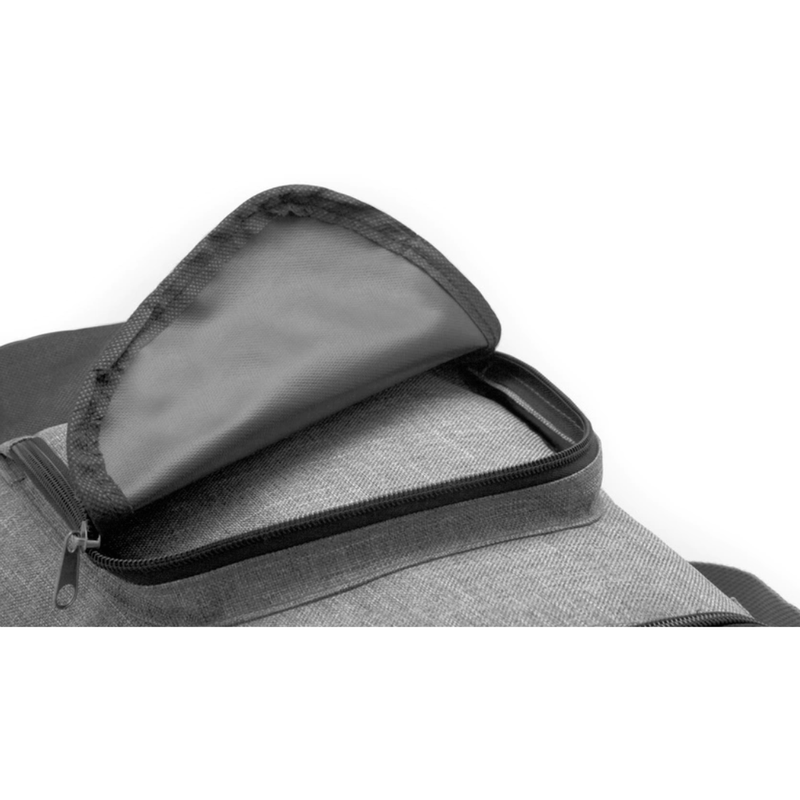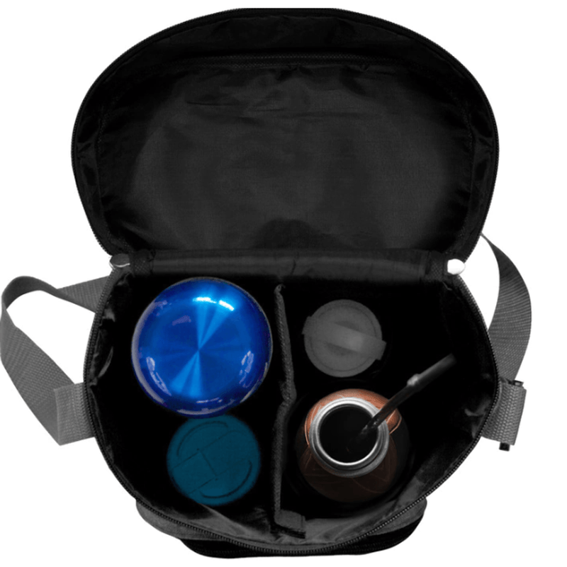 Bolso matero con bolsillo frontal. Interior acolchado con división para un termo o botella y accesorios para mate. Detalle de color negro en la pared inferior. Correa regulable y manija. Medidas: 32 x 22 x 14 cm