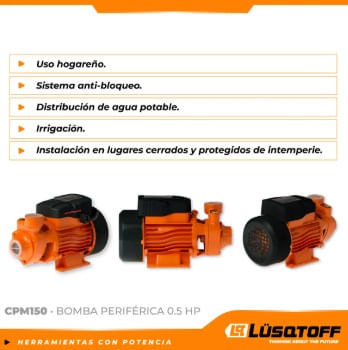 La bomba Lüsqtoff CPM150 genera mayor presión, lo que permite que los líquidos suban hasta una altura máxima de 20m.