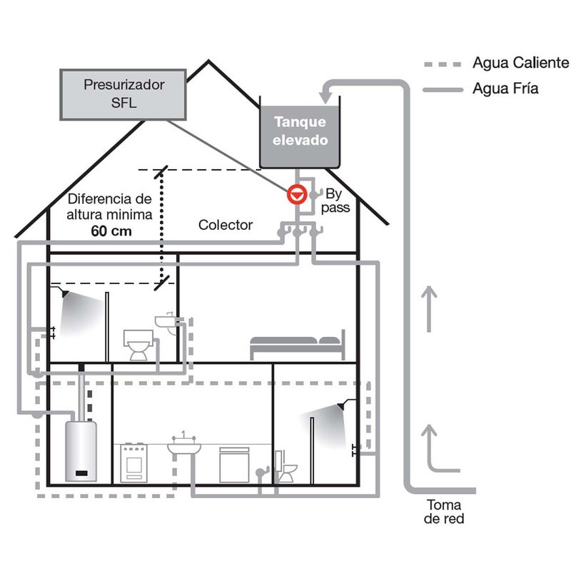 Aumento de presión de agua en residencias en general, nuevas o antiguas con tanque elevado. Apto para viviendas con tuberías de 20 años o más. Hasta 6 duchas