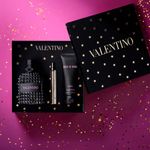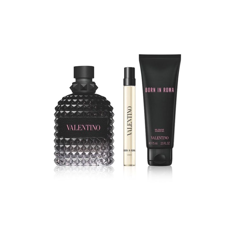 Valentino Born in Roma Uomo ocupa un lugar central en este set de edición limitada vestido con estrellas doradas con un lazo festivo, una invitación a celebrar esos momentos inolvidables.
