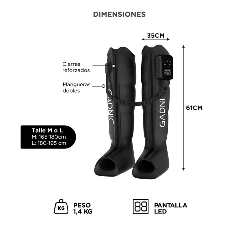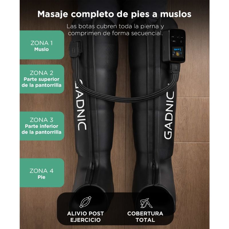 Las botas actúan desde pies a muslos, asegurando un masaje integral con tecnología de presión de aire real.