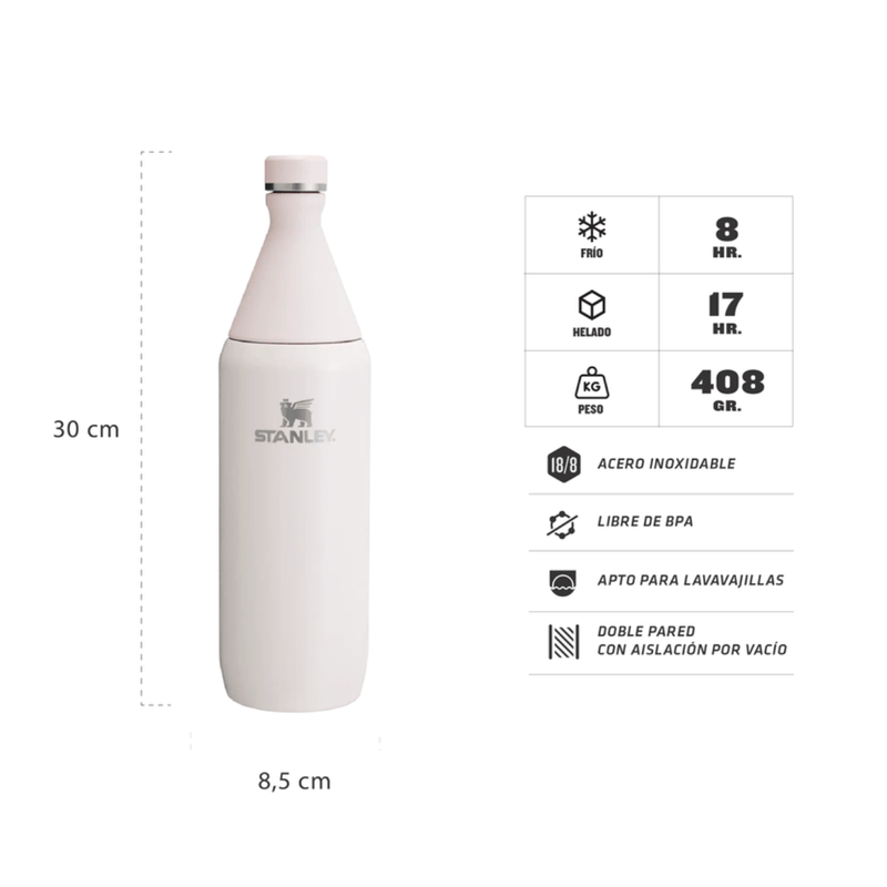 Con una forma icónica, el diseño delgado hace que sea fácil de transportar. Esta botella de agua tiene dos aperturas, la mas grande para poner hielo en la botella y la segunda para tomar directamente. La botella All Day Slim de 1 litro es sustentable, aunque un poco inesperada. Solo dale unas vueltas al cuello para cerrarla y lograr un sello a prueba de fugas y destapa cada vez que necesites beber. La construcción de acero inoxidable proporciona sorbos helados durante horas. ¡Incluso puede contener una botella entera de vino! Ya sea que viva junto a tu bolso de playa o se convierta en tu favorito durante el vuelo, mantén la hidratación simple.
