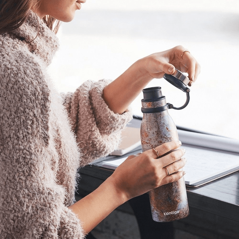 Frío hasta el último sorbo - Contigo Matterhorn está preparado para ayudarte a soportar el calor o el frío. Ya sea en un auto caliente o en una cocina ocupada, Matterhorn mantendrá sus bebidas frías hasta por 18 horas. (Sí, lo leiste bien). Esta botella de agua también está diseñada para mantener sus bebidas calientes hasta por 10 horas. Así que adelante y pruébalo, sabemos que no te decepcionará.