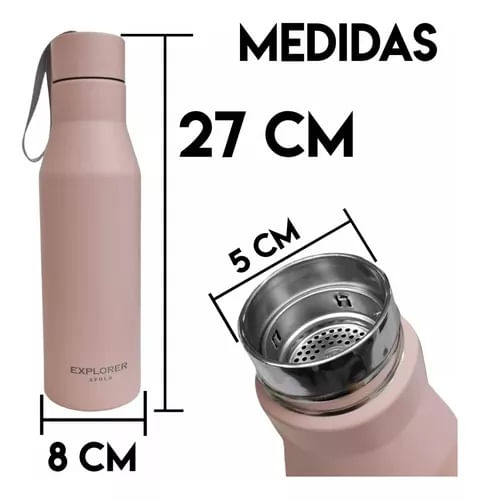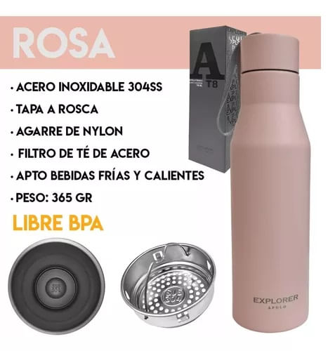 La botella térmica T8 de Explorer Apolo, soporta todo tipo de bebidas frías o calientes hasta un máximo de 24 hs, y 120 horas el hielo. Ideal para quienes tienen viajes o salidas de trekking, llevar al trabajo o la facultad. Además trae en su boquilla un filtro de té desmontable fabricado en acero inoxidable.