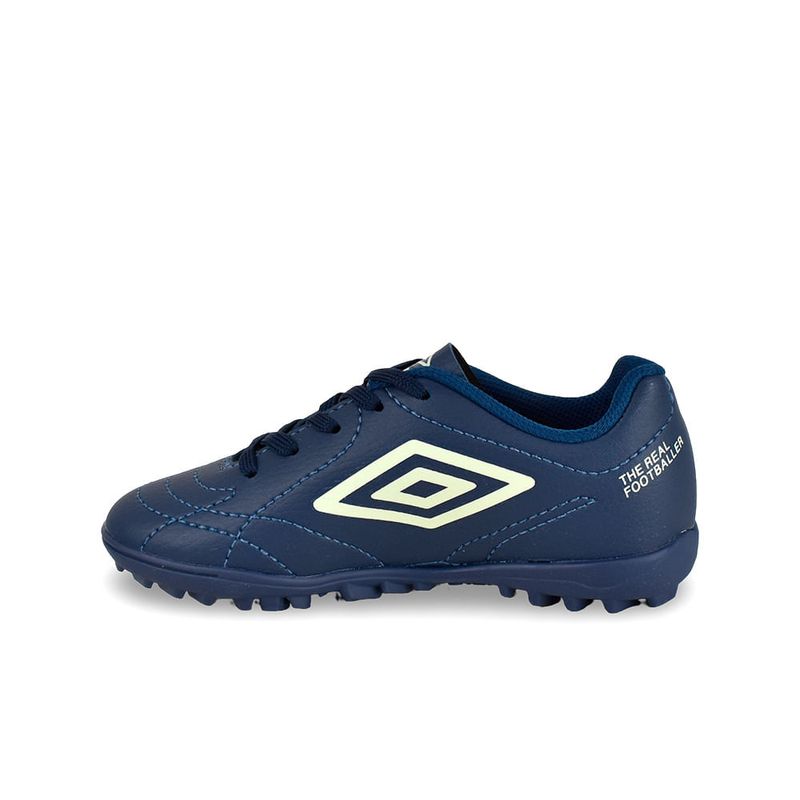 El botín Umbro Class Footballer Jr está diseñado para brindar a los más chicos comodidad, control y tracción en canchas de césped sintético. Su capellada sintética resistente mejora el contacto con la pelota, mientras que la suela con tapones bajos multitaco proporciona excelente agarre. Ideal para quienes dan sus primeros pasos en el fútbol con confianza y estilo.