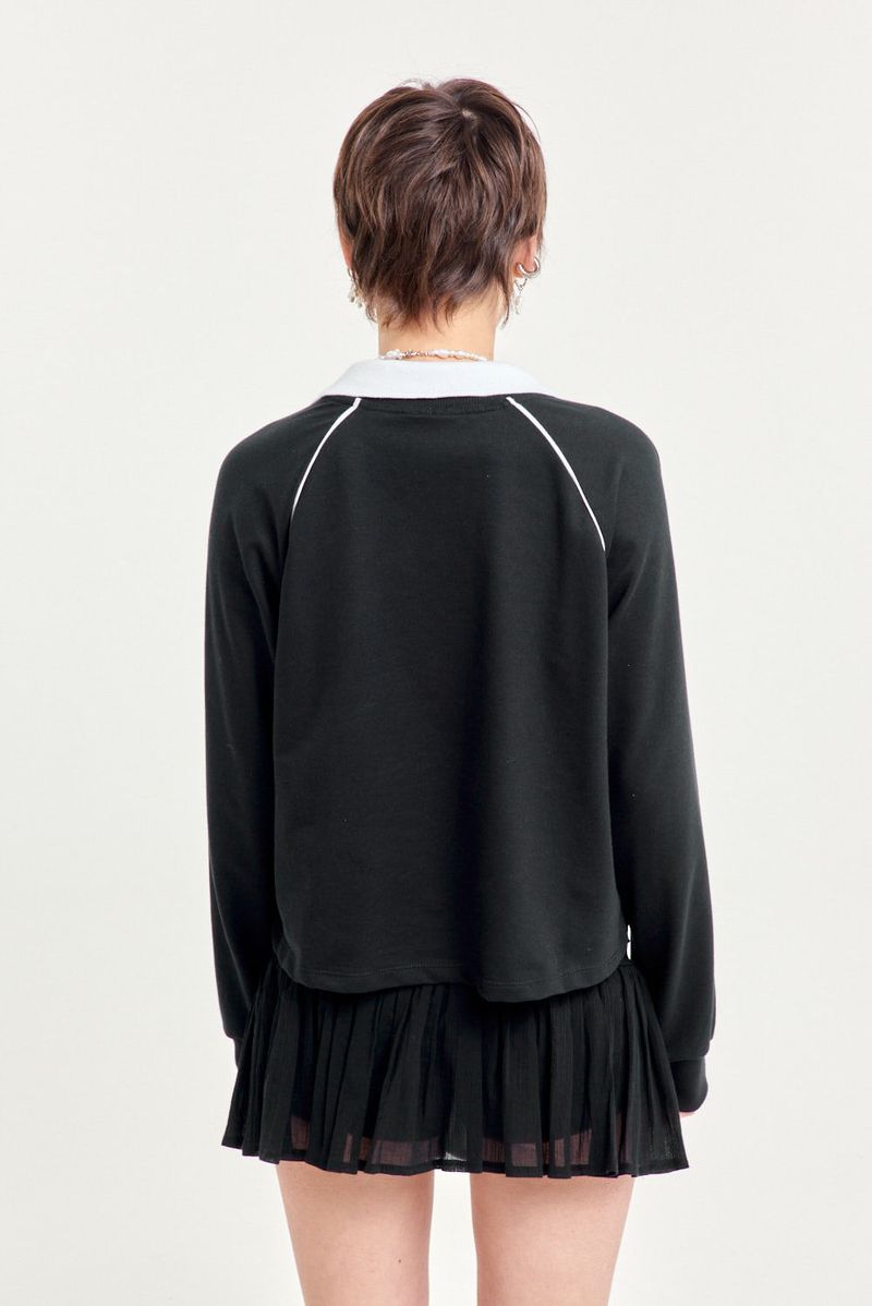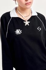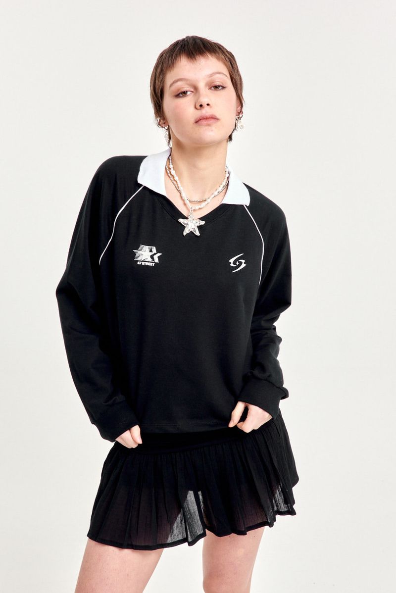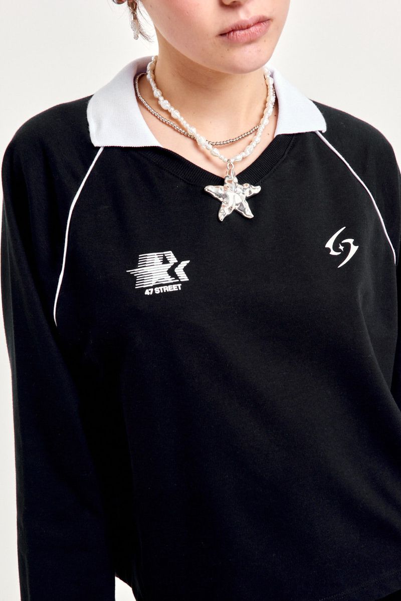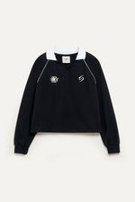 Buzo de rústico con escote en V de morley, cuello tejido a contratono y largo hasta la cadera. Estampa en el frente y vivos a contratono. Perfecto para usar con calzas o denim oversize.