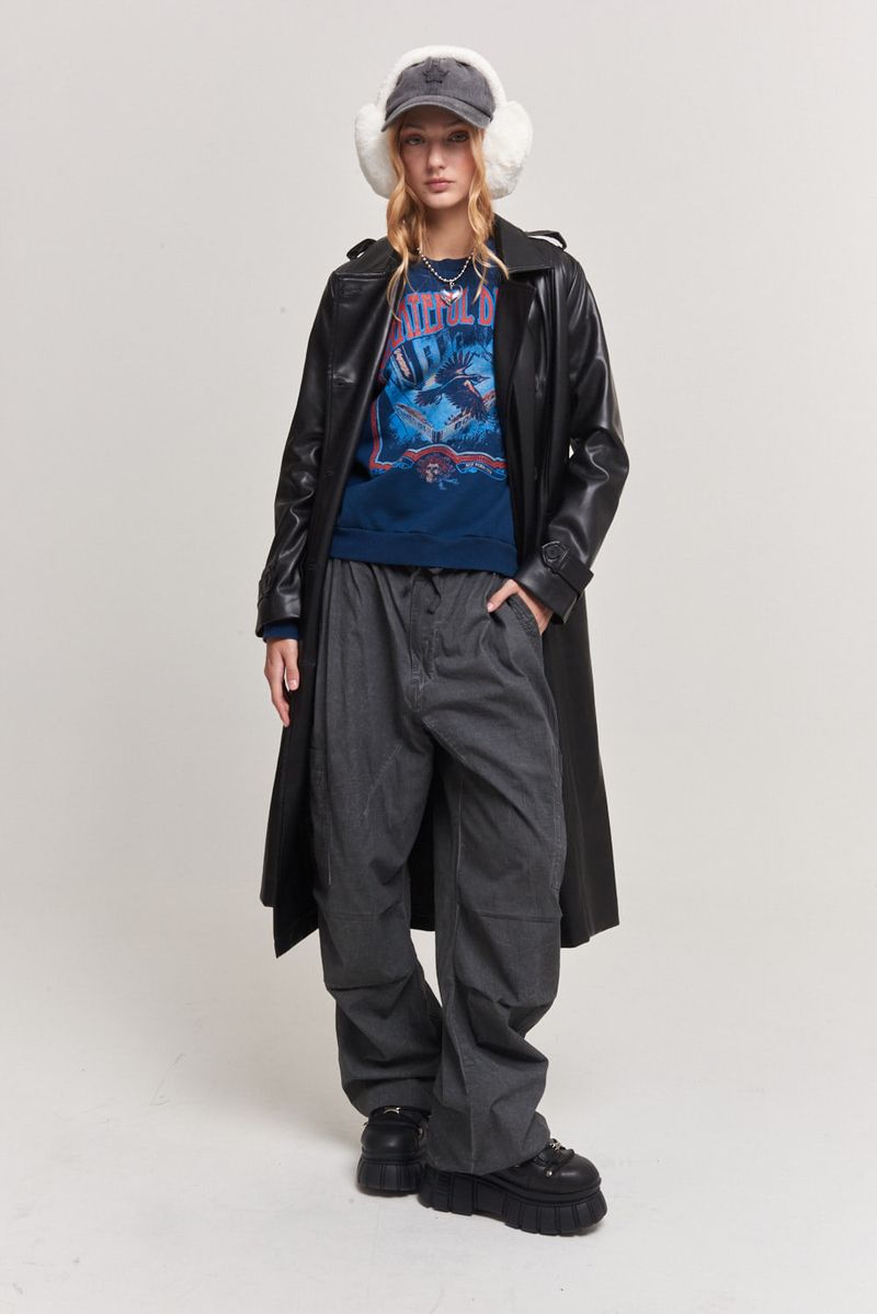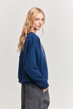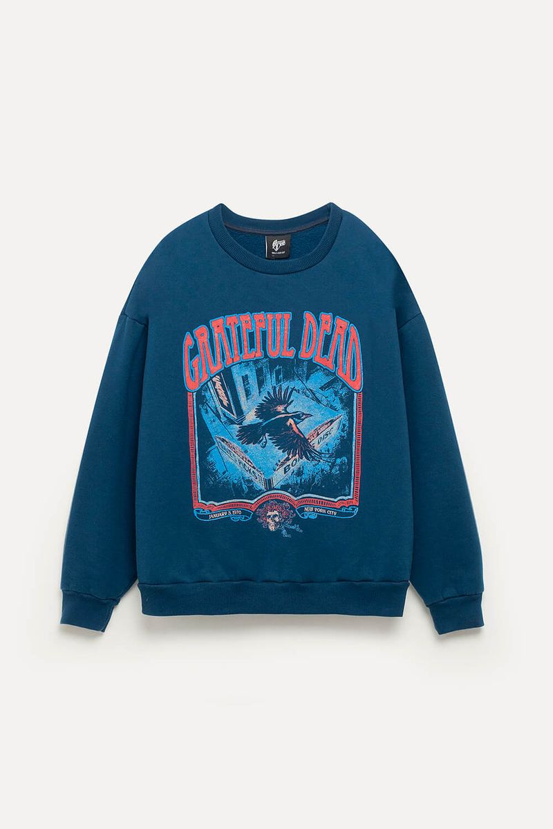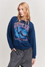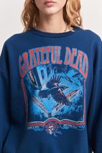 Buzo manga larga de frisa con proceso de lavado artesanal acid wash. Escote redondo y puños aplicados de complemento. Estampa de Greatful Dead en el delantero y grifa institucional.