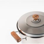 Las asas combinan acero inoxidable con detalles en madera grabada, ofreciendo un diseño elegante y un agarre firme y seguro. Su acabado exterior combina brillo con terminación tipo platino, aportando una estética moderna y sofisticada.