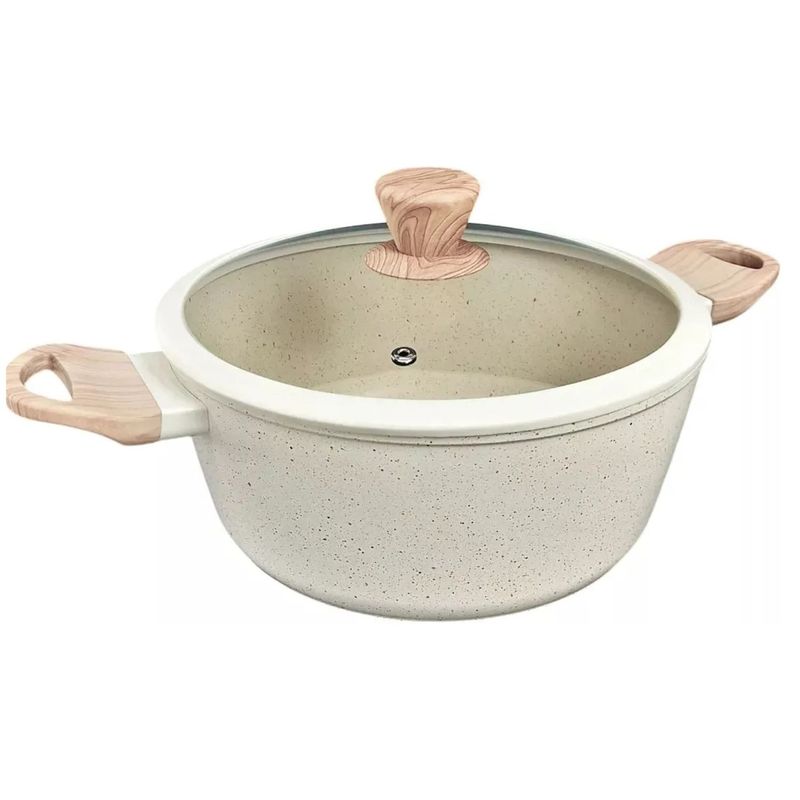 La cacerola antiadherente Carol de 26 cm en beige es perfecta para cocinar de manera eficiente. Permite la cocción con poco aceite, se calienta rápidamente, conserva el calor más tiempo y evita que los alimentos se peguen. Es apta para lavavajillas y fácil de lavar, con un mango siliconado que garantiza comodidad y seguridad. Con un diámetro de 26 cm y una altura de 10.7 cm, es compatible con cocinas a gas, eléctricas e inducción. Está hecha de aluminio forjado y tiene un revestimiento antiadherente en el interior y exterior, además de un fondo de triple capa antiadherente que asegura una distribución uniforme del calor. Incluye una tapa y cuenta con dos sistemas de seguridad. Se recomienda usarla con fuego moderado, evitar esponjas de alambre y objetos metálicos, y emplear utensilios de nylon.