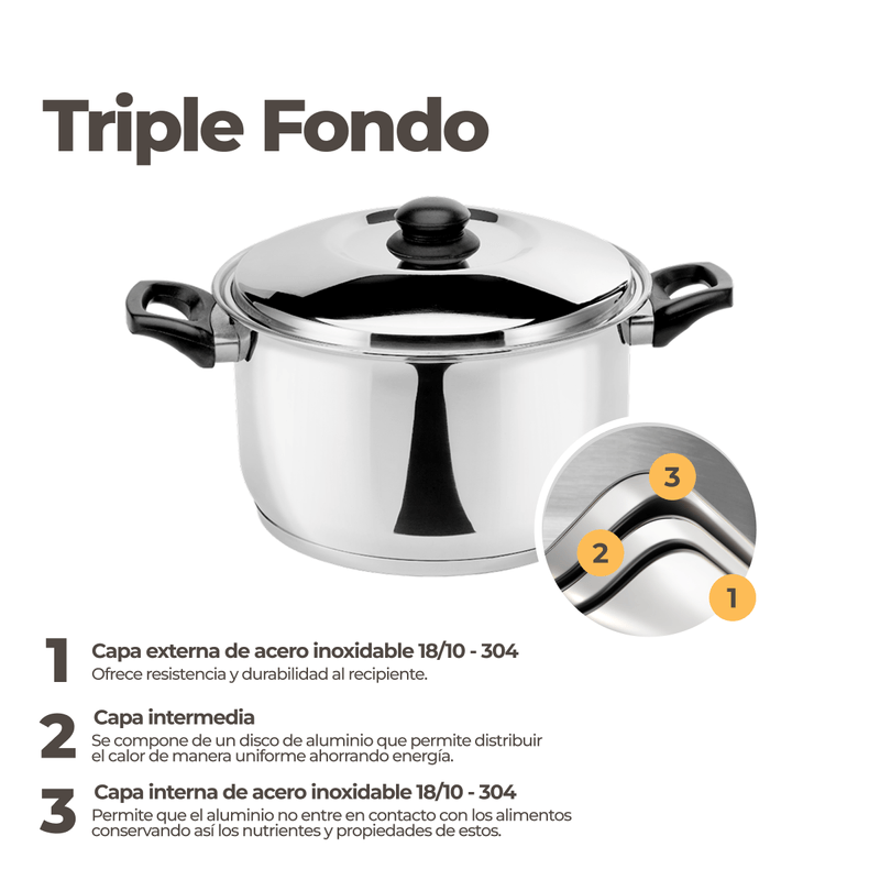 ✔ Triple fondo encapsulado: Distribuye el calor de manera uniforme, asegurando una cocción rápida y eficiente mientras ahorra energía.