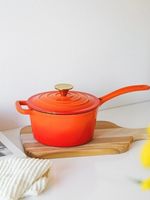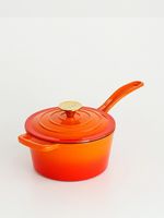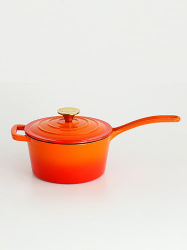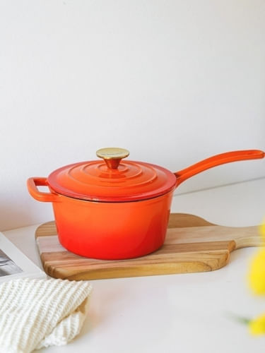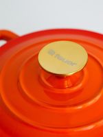 Cacerola con tapa, asa y mango de hierro fundido enlozado. Perilla de la tapa de acero inoxidable pulido de color plata o con recubrimiento de titanio PVD de color bronce según el modelo elegido.