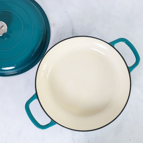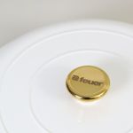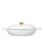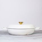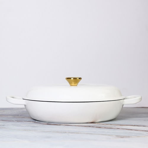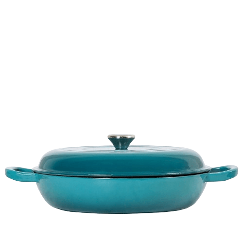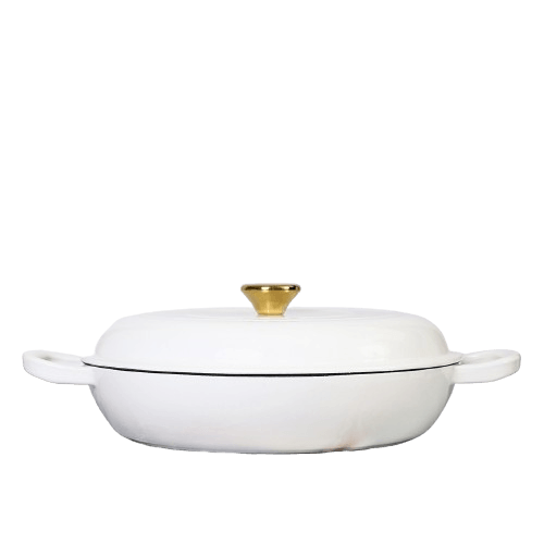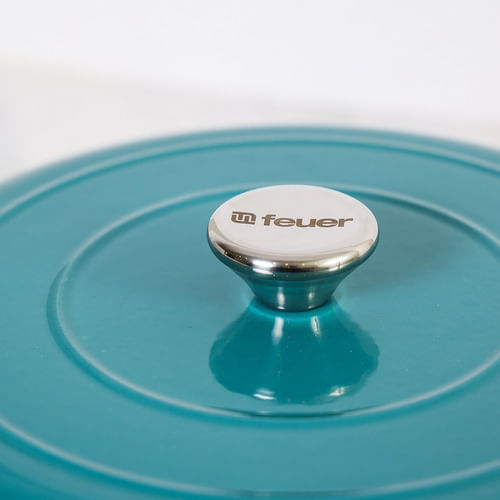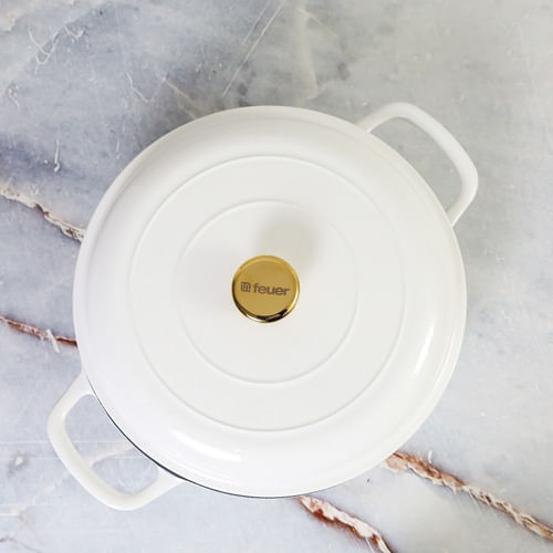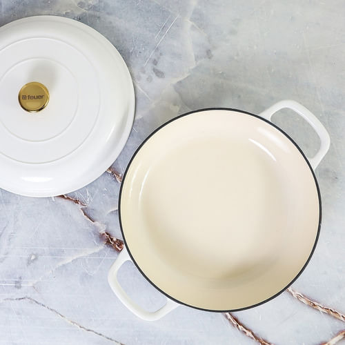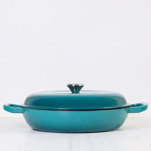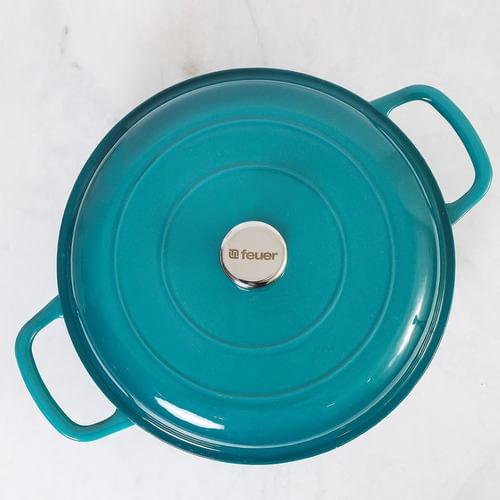 Paellera con tapa, y asas de hierro fundido enlozado. Perilla de la tapa de acero inoxidable pulido de color plata o con recubrimiento de titanio PVD de color bronce según el modelo elegido.