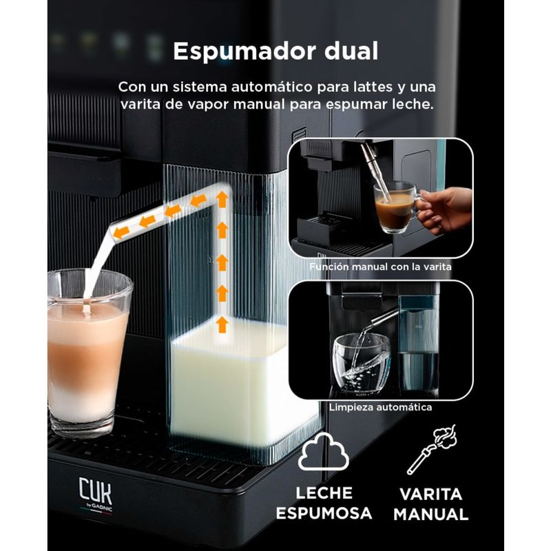 Además, la cafetera incluye un espumador de leche que crea una espuma rica y cremosa para tus cappuccinos y lattes favoritos. La limpieza es sencilla con su bandeja de goteo y tanque de agua removibles, asegurando una experiencia sin complicaciones.