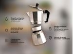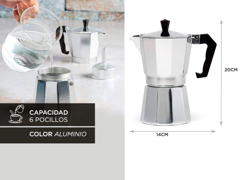 La cafetera de aluminio Gadnic de 6 pocillos cuenta con un diseño moderno y elegante con un cuerpo de aluminio de alta calidad. El mango está hecho de un plástico resistente al calor que no solo te proporciona un agarre firme y fiable, sino que también permite que tu mano se mantenga fría durante el uso. Su eficiente diseño fuerza el agua presurizada a través de granos de café, y deposita una rica mezcla de espresso de cuerpo completo en la cámara de servir.