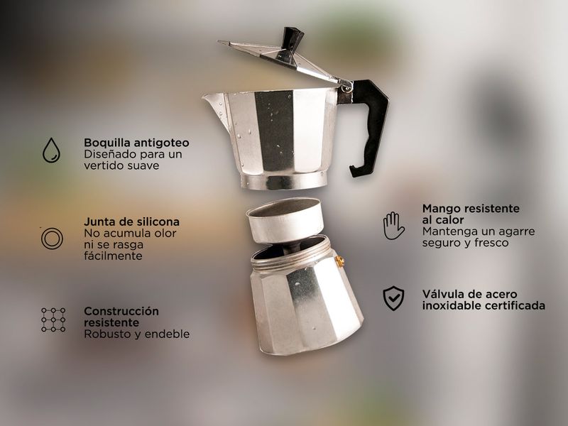 Fácil de limpiar y fácil de usar. Coloca la cafetera de espresso a temperatura baja o media, y dentro de 3 – 5 minutos.