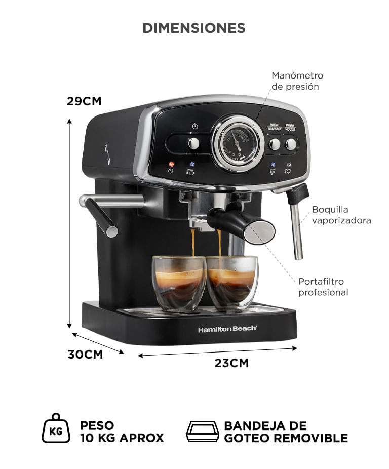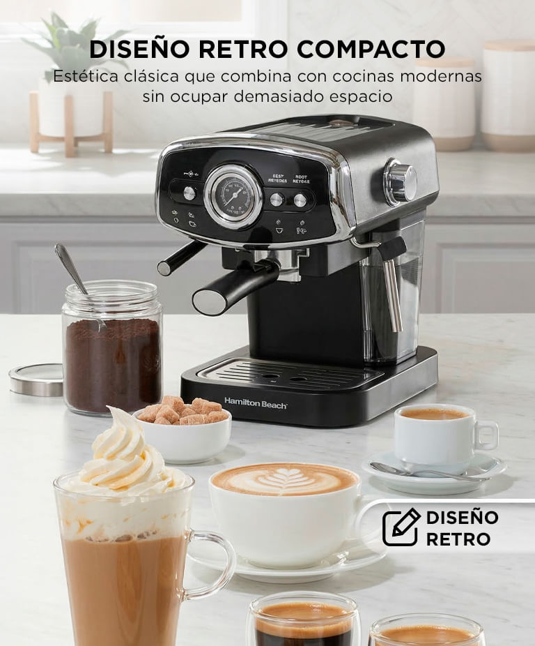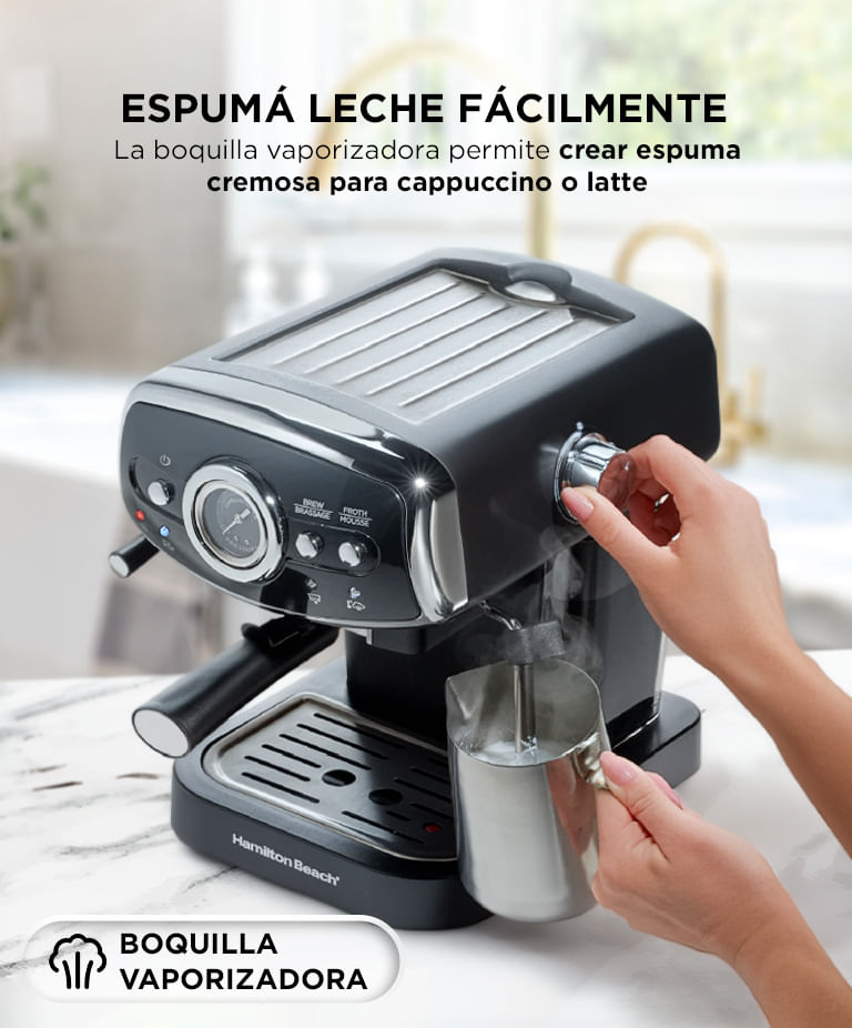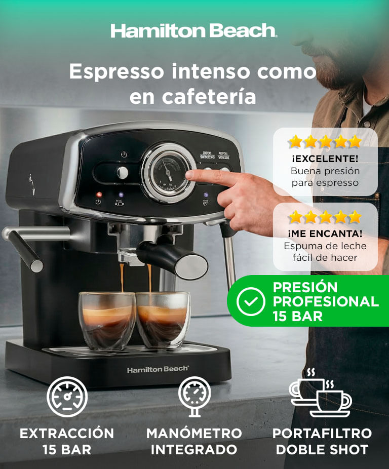 La cafetera espresso Hamilton Beach permite preparar cafe de alta calidad en el hogar. Su bomba de presion de 15 bar permite extraer el sabor autentico del cafe. Esto permite obtener bebidas intensas y aromaticas en cada preparacion. Es ideal para quienes disfrutan espresso cappuccino o latte. Su sistema esta pensado para lograr resultados consistentes.