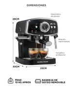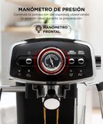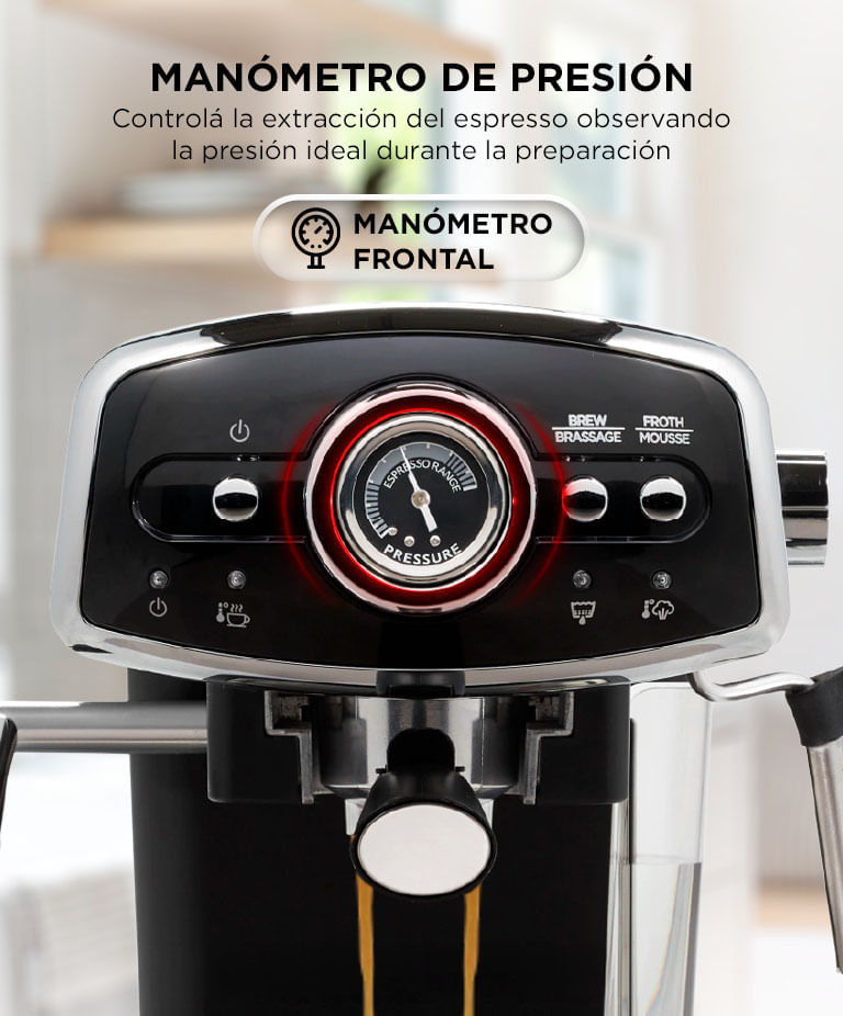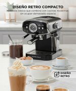 El diseño retro compacto aporta estilo y elegancia a cualquier cocina. Su estructura permite utilizarla facilmente sobre la mesada sin ocupar demasiado espacio. El dial de presion permite controlar la extraccion del espresso durante la preparacion. El sistema de portafiltro facilita colocar y asegurar el cafe. Todo el diseño esta pensado para comodidad y practicidad.