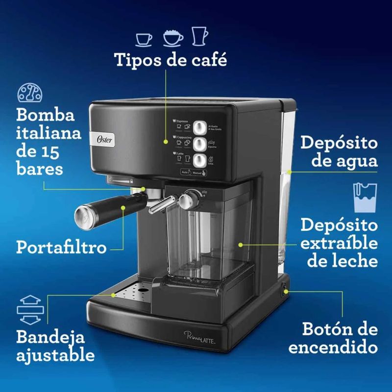 Vive la experiencia de un café auténtico y delicioso que ofrece la cafetera automática de espresso Oster PrimaLatte. Ahora con funciones que te permiten disfrutar variedades de bebidas, desde espresso, capuccinos y lattes, hasta el uso de cápsulas de Dolce Gusto*. Todo al toque de un botón. Prepara tus bebidas favoritas utilizando tu marca predilecta de café molido, mientras automáticamente espumas la leche fresca de tu eleción. Todo servido en la misma taza, al momento que desees. También te ofrece un nuevo diseño, ¡Ideal para tu cocina!