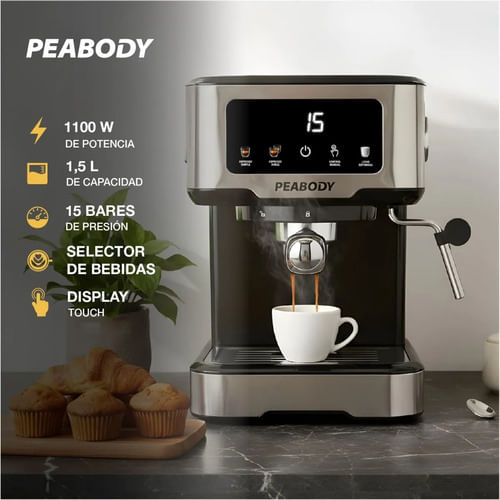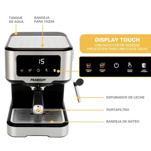 Bebidas Preseteadas: Selectores para Espresso simple, Espresso doble y Leche espumada.