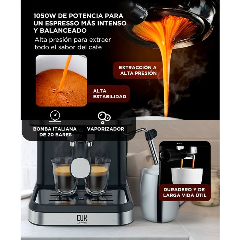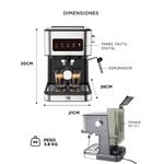 Equipada con depósito de agua desmontable de 1.5 L, boquilla vaporizadora, bandeja antigoteo y portafiltro metálico doble, ofrece comodidad y limpieza rápida. Su estructura de aluminio fundido asegura durabilidad y un acabado moderno.