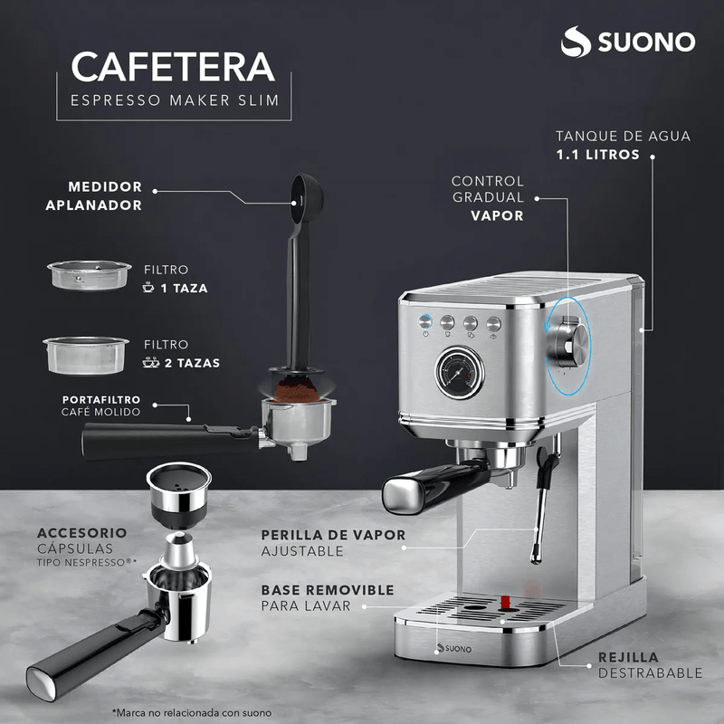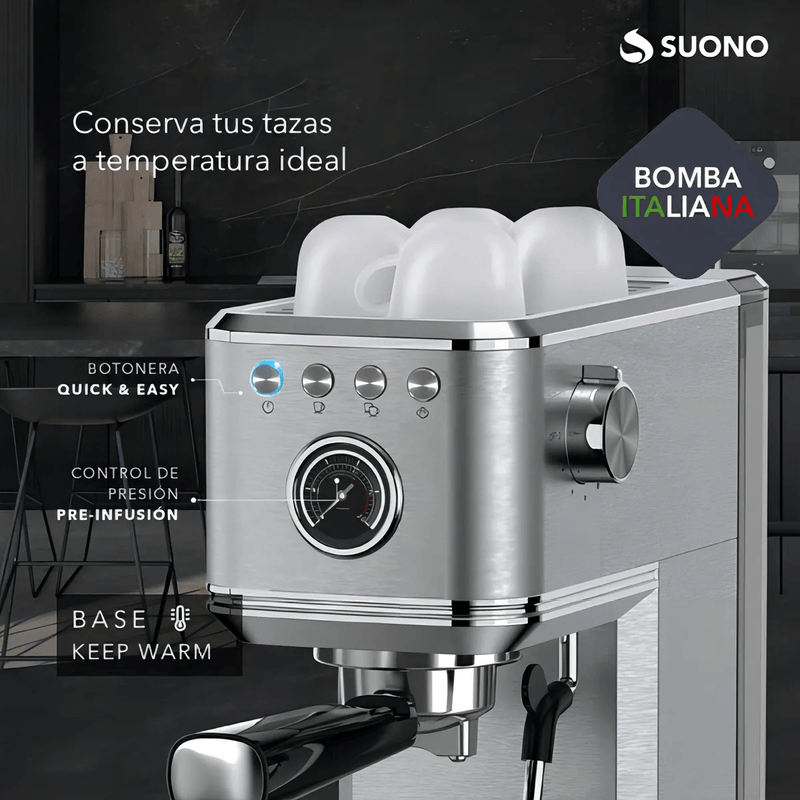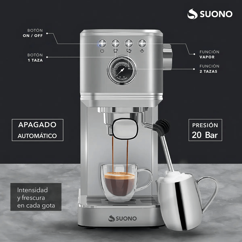 Esta cafetera espresso automática de Suono tiene 20 bares de presión y una capacidad de 1.1 litros. Con un motor potente de 1350 W, está diseñada para preparar café de alta calidad. Es compatible con cápsulas tipo Nespresso, brindando flexibilidad para disfrutar de diferentes tipos de café.