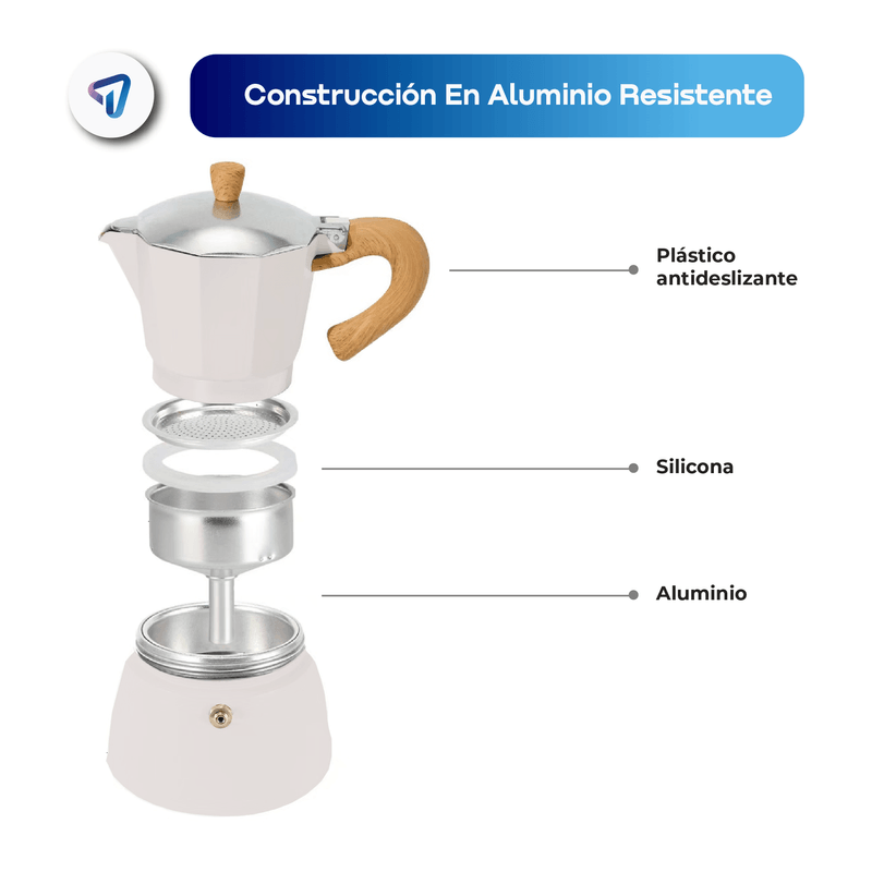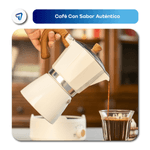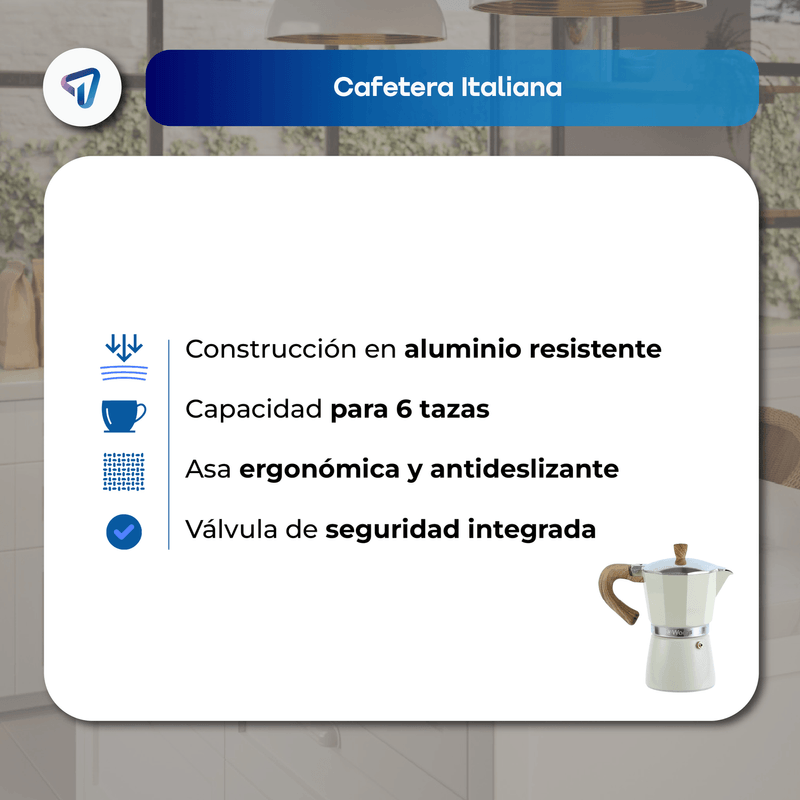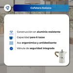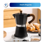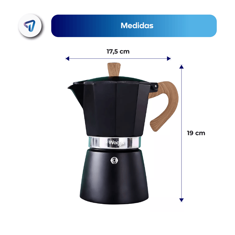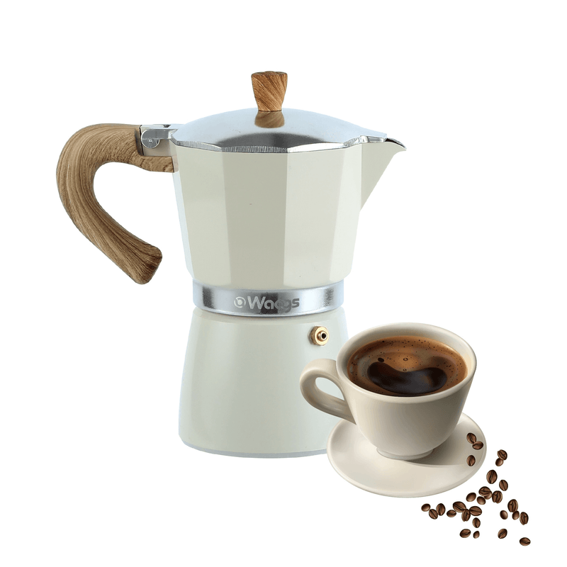 Cafetera italiana WAGGS de aluminio, con diseño clásico inspirado en la auténtica moka italiana. Permite preparar hasta 6 tazas (300 ml) con una extracción intensa y equilibrada, resaltando el sabor y aroma del café. Fabricada en aluminio pulido con mango de madera ergonómico y resistente al calor, es compatible con cocinas a gas, eléctricas y vitrocerámicas (no apta para inducción). Incorpora válvula de seguridad para mayor confiabilidad. Dimensiones: 19 × 17,5 × 9 cm, peso aprox. 500 g. Disponible en color negro/crema. Incluye cafetera italiana WAGGS.