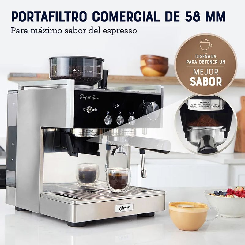 La Cafetera para espresso Oster Perfect Brew Máxima de 15 bares con molino integrado tiene todo lo que necesitas para crear un delicioso café.