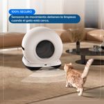 Sensores de movimiento detienen la limpieza automáticamente cuando el gato está cerca, garantizando su seguridad en todo momento.