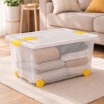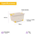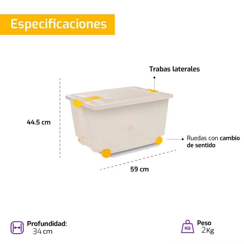 Caja con ruedas, trabas laterales, y tapa con compartimento para desodorante naftalina, capacidad 52 litros.