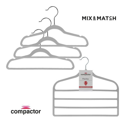 60 PERCHAS + 4 PERCHA PARA PANTALON NEGRAS,BEIGE,GRISES TOTAL : 64 PERCHAS Perchas ultrafinas, ultralivianas, anti deslizantes y super resistente. OPTIMIZAN EL ESPACIO EN TU PLACARD. No marcan la ropa. Sirve para todo tipo de ropa. 60 Perchas Ancho : 44.5 cm Altura: 22.5 cm Gancho de metal reforzado. Cuerpo de la percha revestida en terciopelo. 4 perchas de pantalón medida 45 X 33,5 (SIN GANCHO) o 41,5 (CON GANCHO) cm. Origen: China Marca: Compactor