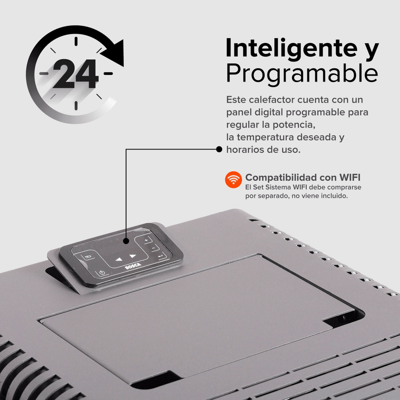 Este calefactor cuenta con un panel digital programable para regular la potencia, la temperatura deseada y horarios de uso.