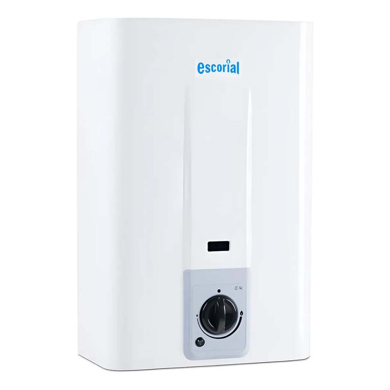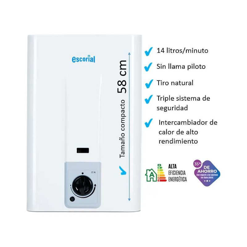 ¡Calentador de agua Escorial de 14L para gas natural! Encendido automático, eficiencia energética A y ahorro del 35% frente a modelos con llama piloto. ¡Agua caliente al instante y eficiente!