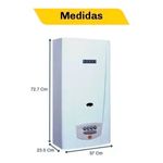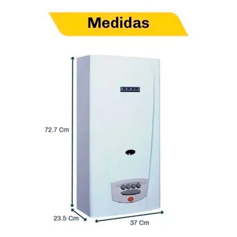 Calefón tiraje natural de 14 l/min de tamaño tradicional. Comando a botonera. Encendido electrónico.