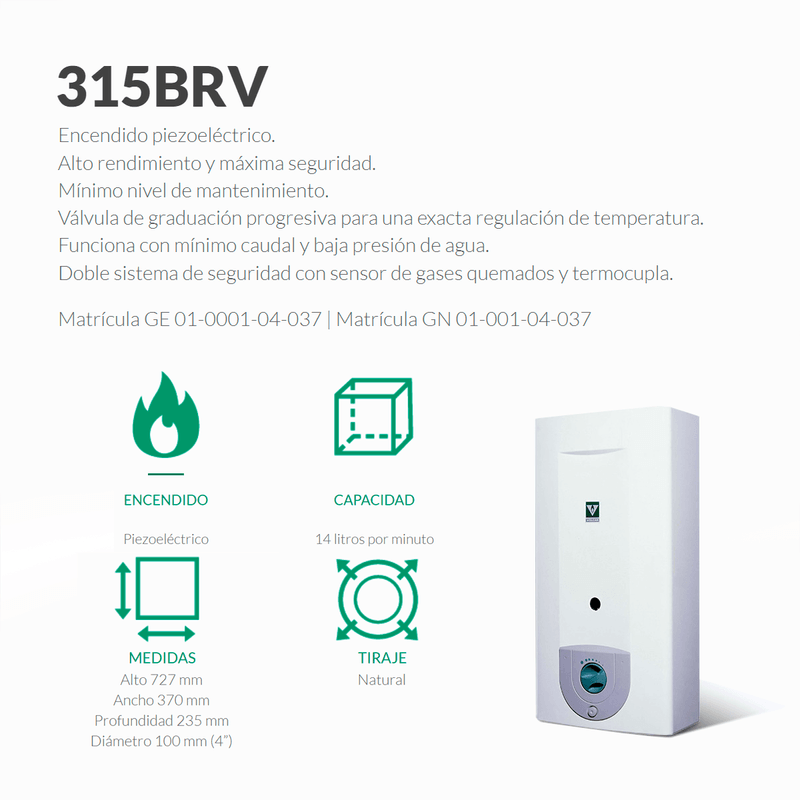 Calefón Tiraje Natural 14 Lts Piezoeléctrico Gas Natural