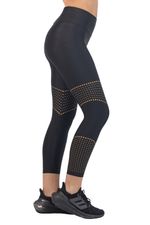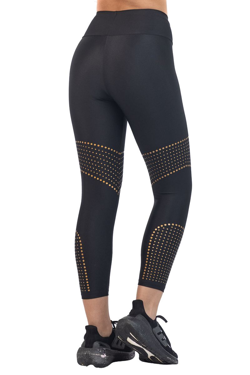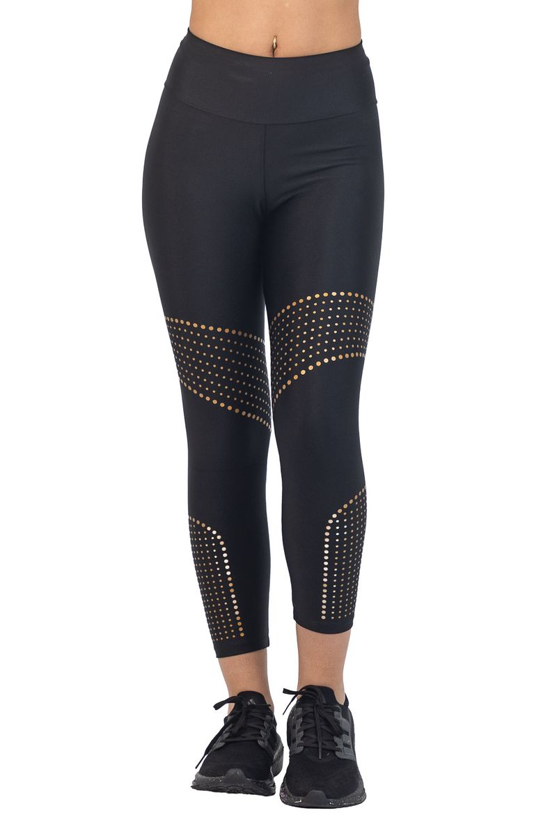 Calza tiro alto realizada en Lycra brillante, con cintura que da un efecto levante. Diseño único de estampa sectorizada en gold. Posee elastico en la cintura y costuras reforzadas.