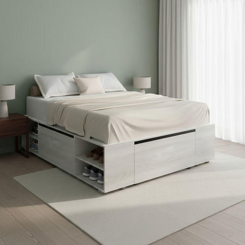 El Box Reflex 2 plazas transforma tu espacio con funcionalidad y estilo. Con cuatro puertas basculantes laterales y estantes en la piecera, este mueble en melamina de 15mm es ideal para mantener todo organizado y a mano.