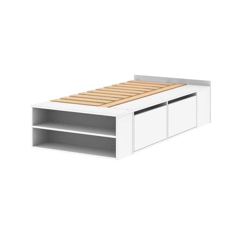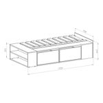 - Configuración: 2 cajones laterales + estantería en el pie de cama.