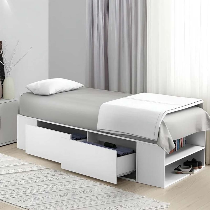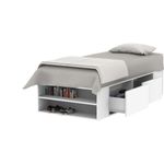 La cama box de 1 plaza con cajones y estantería combina funcionalidad y estilo en un solo mueble. Su estructura en melamina blanca aporta un diseño moderno y minimalista, ideal para cualquier ambiente. Con su configuración adaptable, te permite aprovechar al máximo el espacio sin renunciar a la estética.