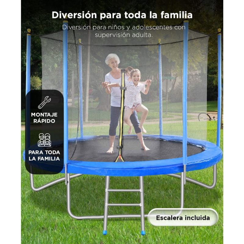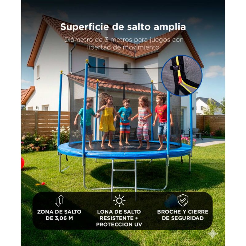 Con diámetro total de 10FT (304 cm), ofrece espacio para saltar libremente, incluso entre adolescentes o adultos.