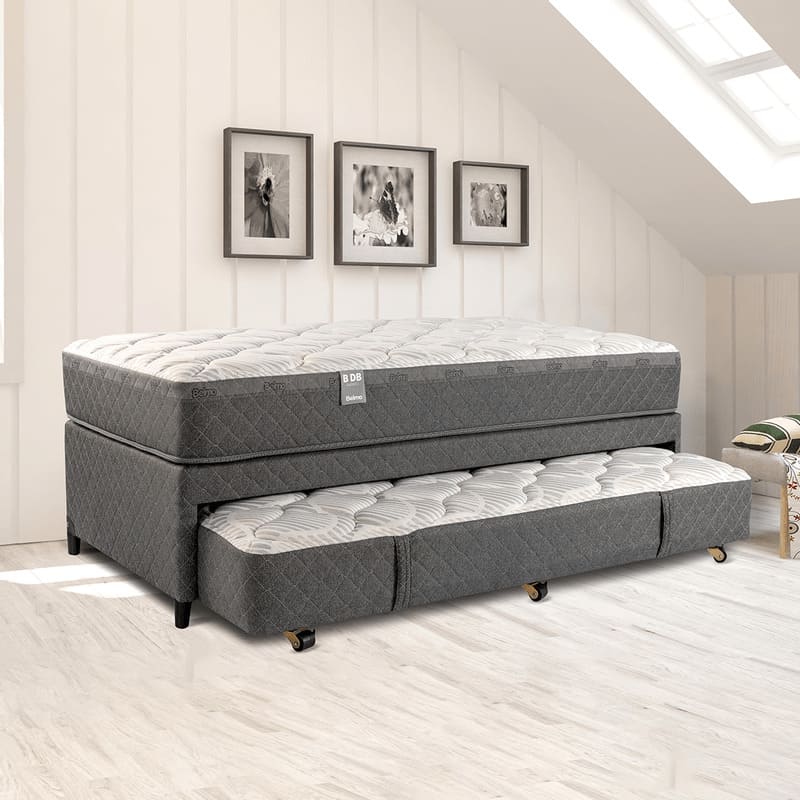 DuoBed se compone de tres productos: colchón Belspring2, cama y carrito con colchón extra incluido. El colchón Belspring 2 posee una base de resortes bicónicos templados electrónicamente, unidos entre sí por un espiral de acero con estabilizadores de espuma de polietileno perimetral y marco perimetral de espuma de poliuretano extra firme que brinda la más agradable sensación de confort de acuerdo al sistema Europeo. También posee un extra pillow interior, una manta extra confortable, combinado con acolchados y rellenos de la mejor calidad. La superficie matelaseada en tejido de punto de algodón combinada con los laterales tapizados en tela de Jacquard, jerarquizan la belleza exterior del producto. Ambos colchones, poseen un sistema NonTurn que permite que nunca sean dados vuelta. La cama es de madera, tapizada en tela de Jacquard matelaseada en su totalidad. La base auxiliar posee 6 ruedas con frenos y doble manija para extracción de cama adicional carrito. ¡DuoBed es una cama con resortes súper confortable para todos! Su sistema de colchón carrito permite aprovechar mejor los espacios del dormitorio, solucionar el buen descanso de los invitados y mantener el cuarto más ordenado. Medidas totales: Largo: 200 cm Ancho: 100 cm Alto total: 68 cm. Medida cama superior: Largo: 200 cm Ancho: 100 cm Espesor: 26 cm. Medida cama inferior: Largo 190 cm Ancho: 90 cm Espesor: 26 cm.