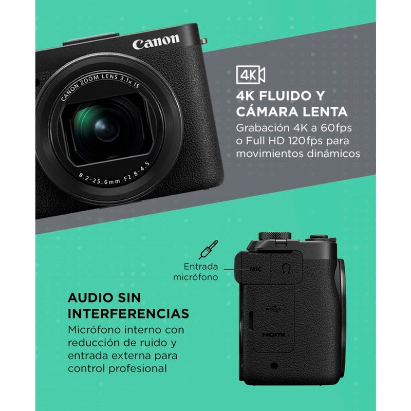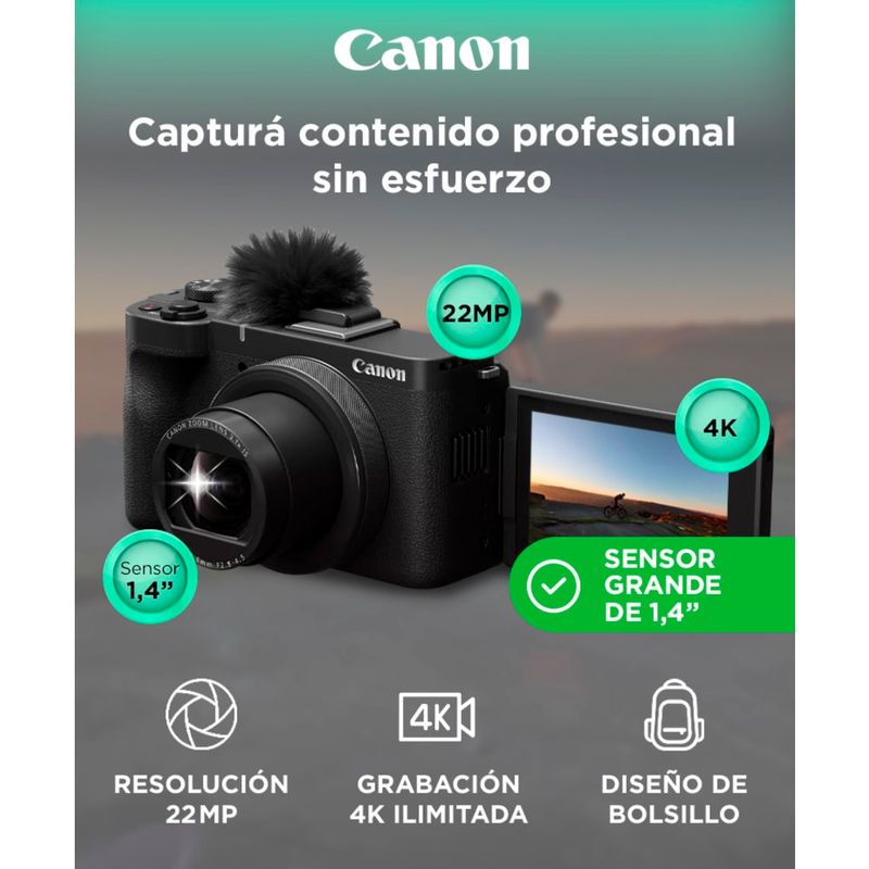 La PowerShot V1 combina una gran calidad de imagen con un cuerpo compacto. Su sensor de 1,4? y 22?MP ofrece detalles impresionantes y excelente rendimiento con poca luz para fotos y videos vibrantes.
