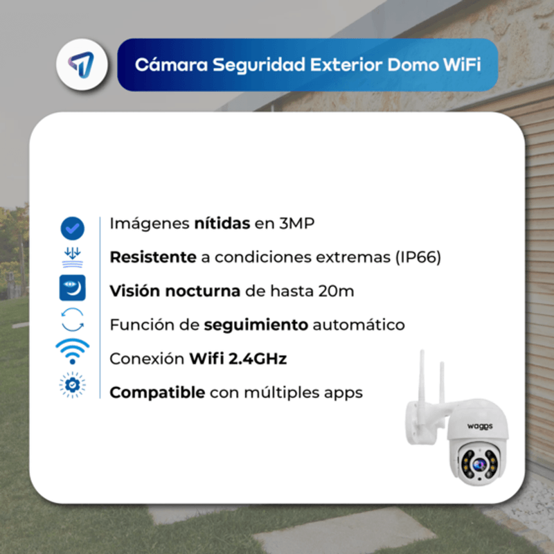 Protegé tu hogar o negocio con la Cámara de Seguridad Exterior WAGGS Domo Wifi IP 3MP, diseñada para brindar vigilancia clara, continua y sin complicaciones. Su resolución 3MP ofrece imágenes nítidas día y noche, mientras que la visión nocturna IR permite monitoreo efectivo incluso en total oscuridad. Gracias a su sistema de autotracking, la cámara sigue automáticamente los movimientos, ampliando la cobertura sin ajustes manuales. La certificación IP66 la hace resistente a lluvia, polvo y condiciones climáticas exigentes. Se controla fácilmente desde el celular vía WiFi con audio bidireccional integrado. Una solución confiable, moderna y eficiente para reforzar tu seguridad exterior.
