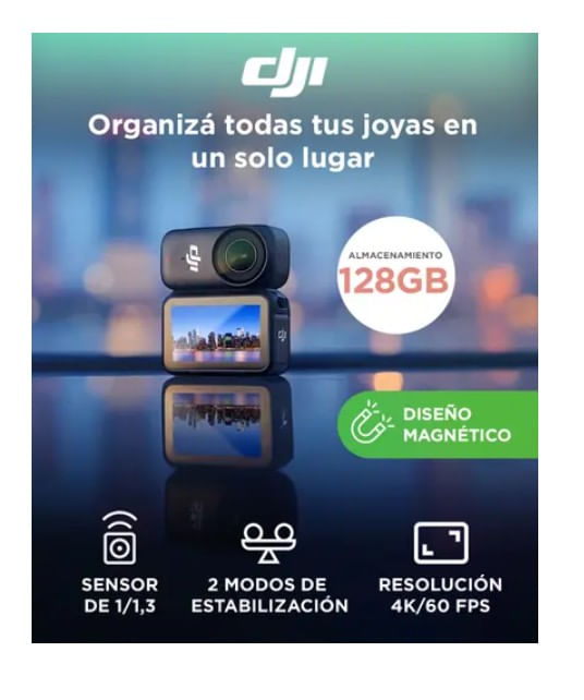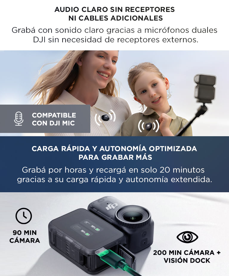 Guardá todo directamente en sus 64?GB internos. Además, conectá micrófonos DJI duales sin necesidad de receptores: sonido estéreo claro, ideal para vlogs y entrevistas.