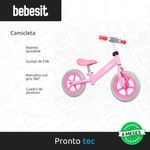 La camicleta Bebesit es el primer paso ideal para que los niños aprendan a andar en bicicleta de forma segura y divertida. Su estructura liviana y resistente favorece el equilibrio y la coordinación, preparando a los pequeños para pedalear sin ruedas de apoyo. Cuenta con ruedas de EVA antideslizantes, manubrio con giro 360° y asiento regulable en altura, que se adapta al crecimiento del niño y garantiza comodidad en cada paseo.
