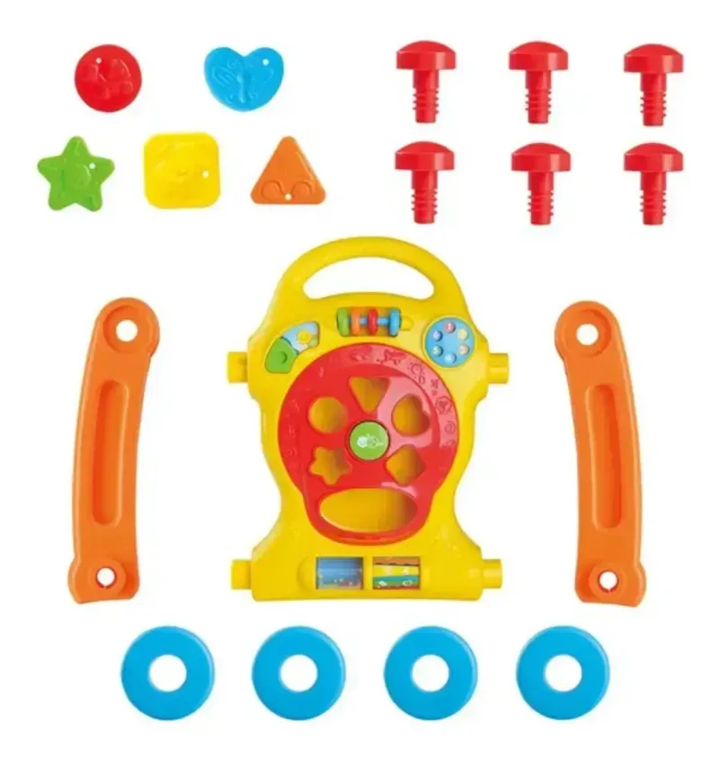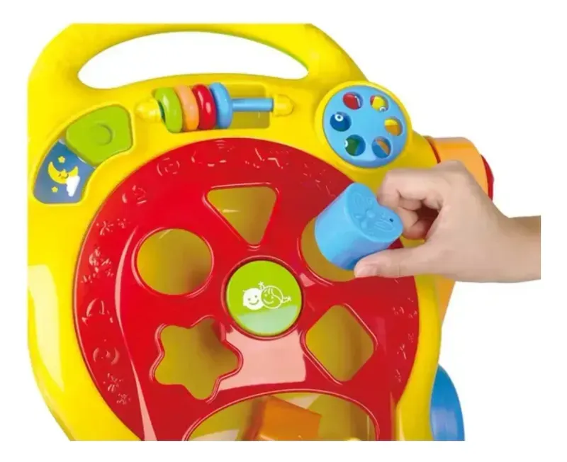 Incluye muchas actividades de giro, clic, ruido y movimiento en el frente, incluido un juguete clasificador de formas completo.
