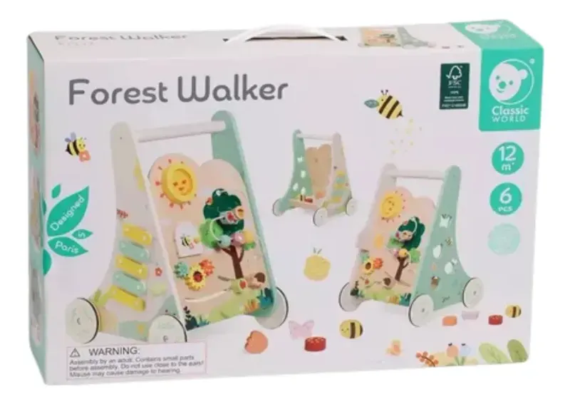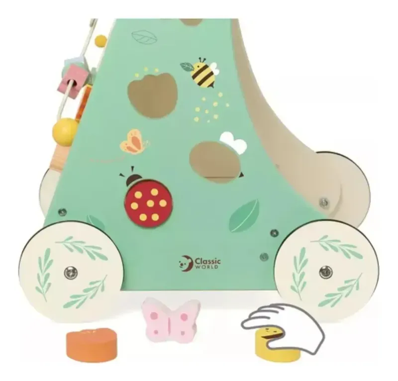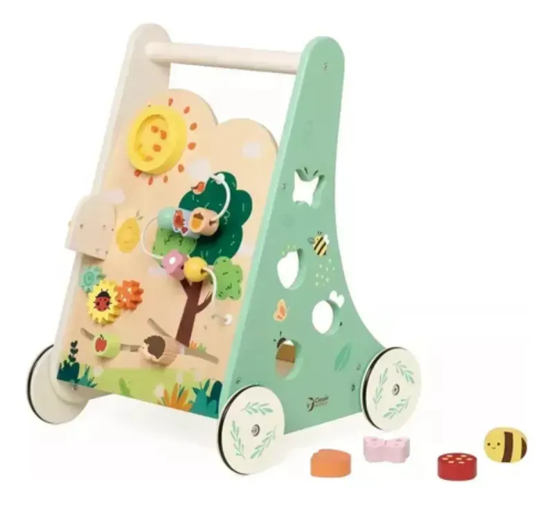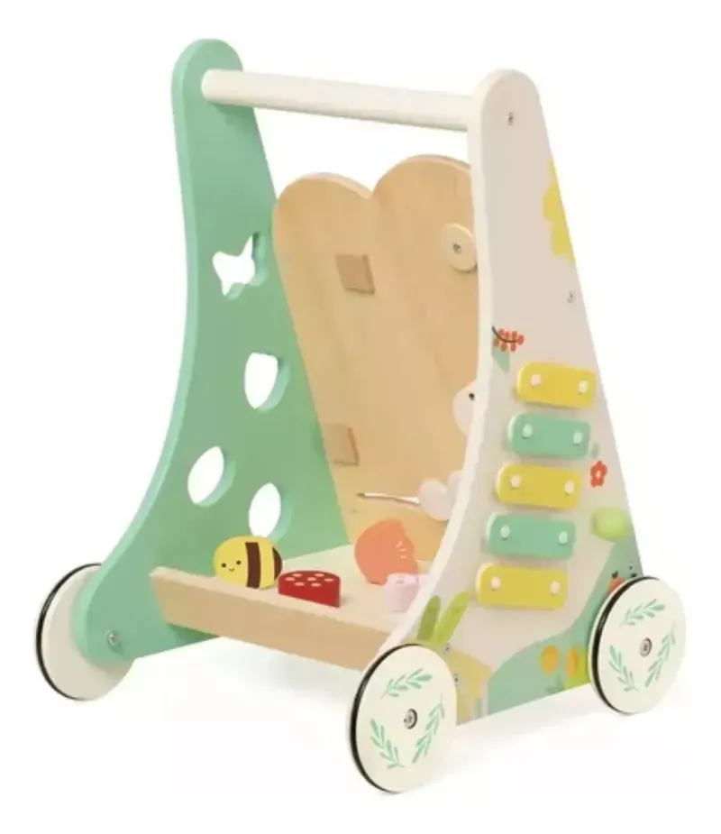 Un andador robusto y de diseño único, que permitirá al niño sostenerse de pie y empujarlo con toda facilidad. Incluye bloques para encajar, un puzzle sencillo, xilofón y ruedas dentadas.