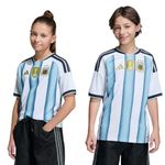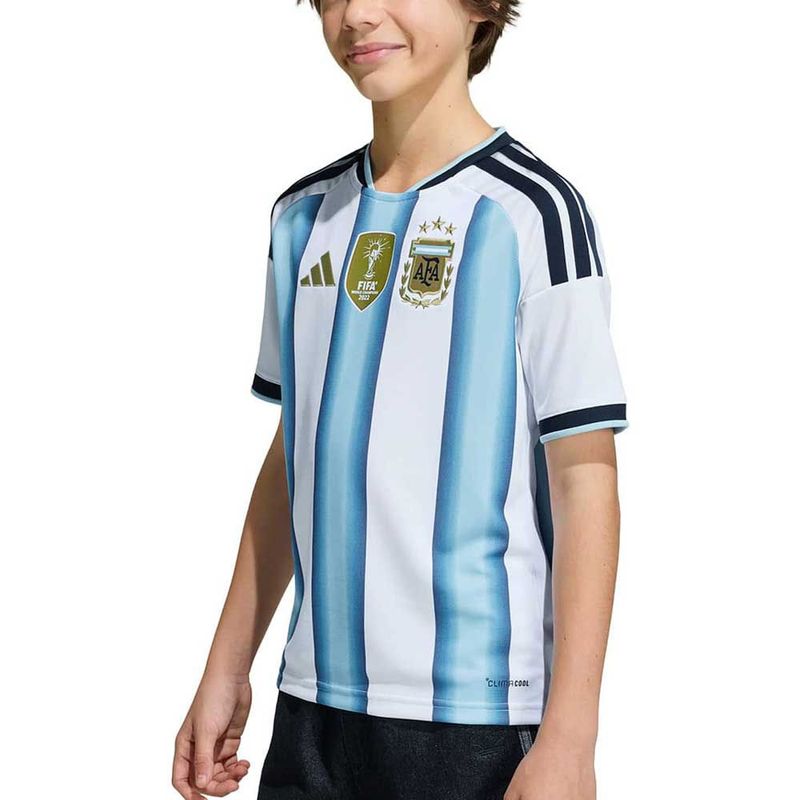 Esta prenda es el símbolo del legado futbolístico de Argentina, diseñada por Adidas para inspirar a la próxima generación de estrellas. Con un diseño que rinde homenaje a las tres victorias mundialistas, es perfecta para alentar o jugar con el espíritu de la Albiceleste. Absorbe y dispersa el sudor, manteniendo la piel fresca, seca y lista para el rendimiento sin distracciones. Presenta las icónicas franjas celestes y blancas en un sutil efecto degradado de tres tonos, con ribetes negros elegantes en los costados y las mangas. Confeccionada en tejido de doble punto 100% poliéster reciclado, ofreciendo durabilidad y un tacto suave contra la piel. Cuenta con un corte clásico, cuello redondo y mangas cortas para un ajuste regular y libertad de movimiento.